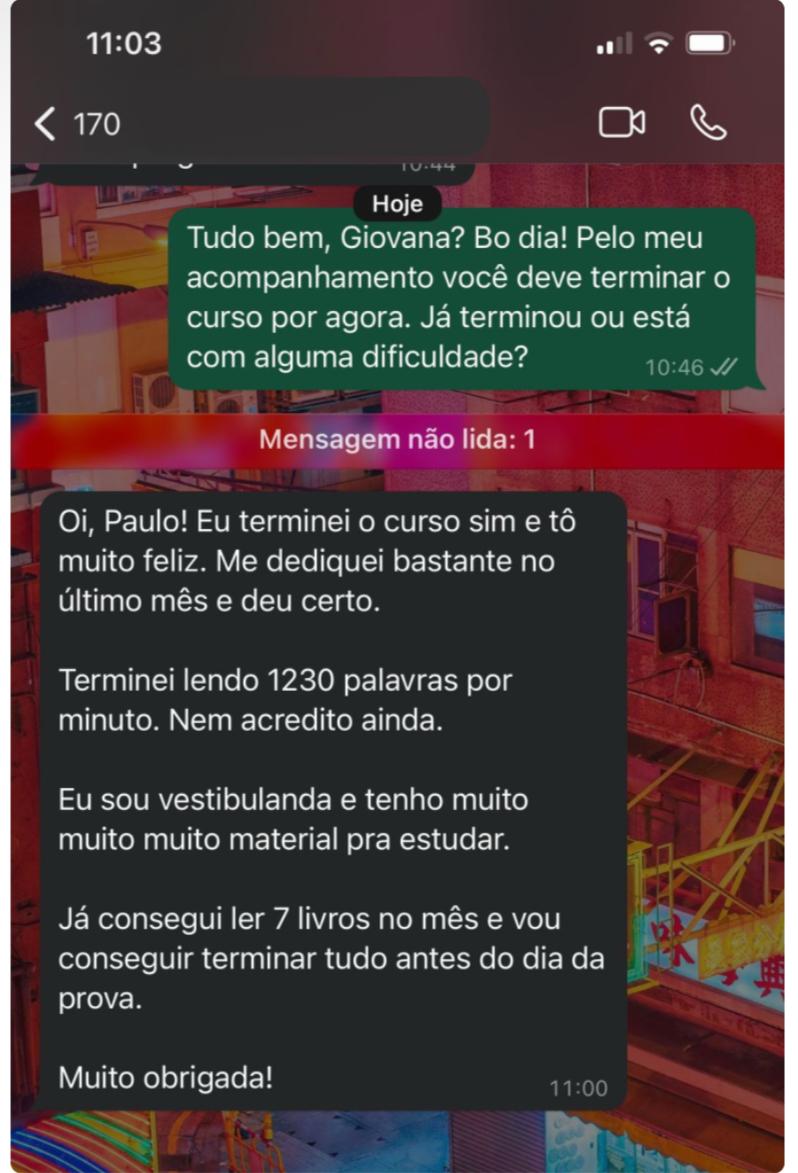 Não se preocupe! O curso é totalmente flexível e você pode fazer no seu ritmo. Se precisar de mais tempo em alguma etapa, basta seguir de forma gradual. Você também pode repetir as aulas e exercícios quantas vezes quiser durante o período de acesso. Porém, o ideal é não parar de fazer o curso, pois pode regredir na sua velocidade de leitura, caso já tenha alcançado algum progresso. Caso o aluno tenha dificuldade em alguma etapa específica, estarei disponível para ajudá-lo a superar qualquer obstáculo.