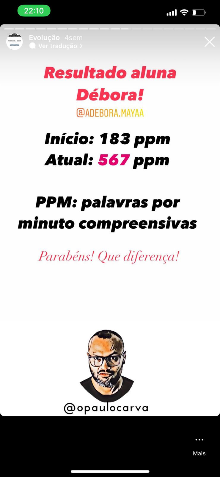 Isso vai depender do seu esforço e desejo de melhorar. Há muitos alunos que já dobram a velocidade de leitura na primeira semana. O curso foi desenhado para que com 10 minutos por dia, você tenha sua leitura totalmente destravada após 40 dias de treinos. Mas, se o aluno dedicar 20 minutos diários, dividido em dois tempos de 10 minutos, um pela manhã e outro à tarde, por exemplo, terá resultados muito mais expressivos.
